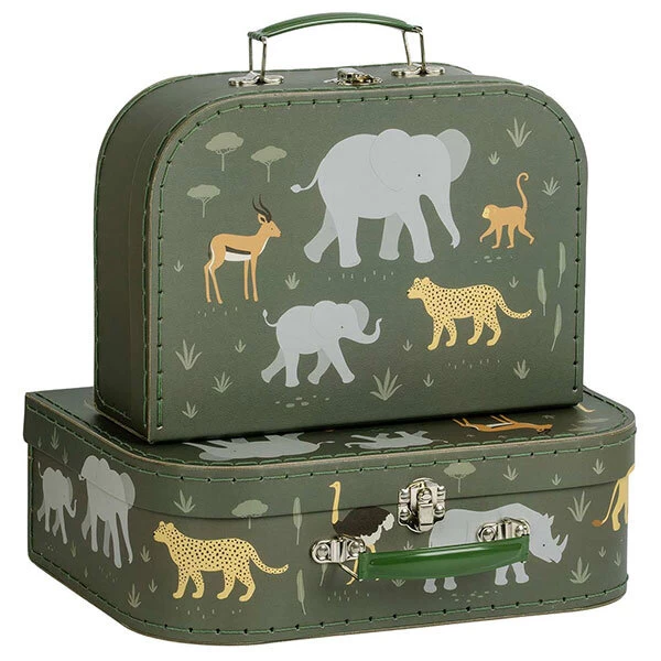 Kofferset Savanne is een set van twee kartonnen koffertjes in verschillend formaat met een leuk design. De koffertjes zijn leuk om mee te spelen en handig om speelgoed in op te bergen. Bovendien staan de kinderkoffertjes mooi als decoratie op de baby- of de kinderkamer. Afgewerkt met een metalen handgreep en sluiting. Leuk om cadeau te geven.