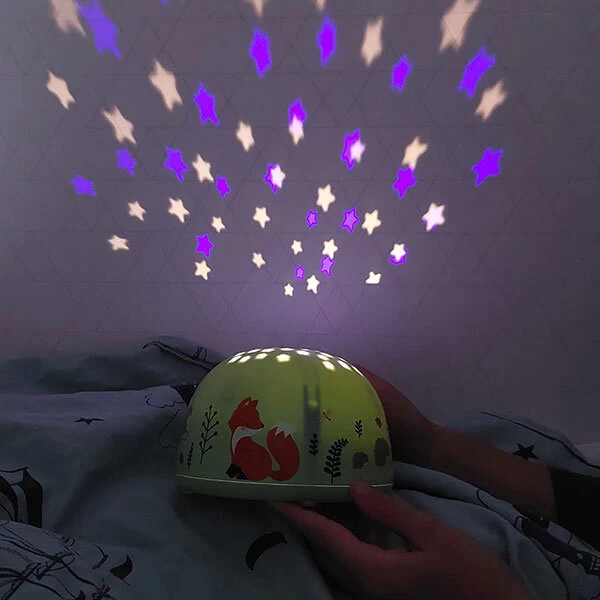 Deze baby projector bosvriendjes projecteert sterren op het plafond van de baby- en kinderkamer. Met de schakelaar wissel je gemakkelijk tussen verschillende kleuren sterren: regenboogkleuren, oranje, groen of blauw. Door de handige timer schakelt de projector lamp automatisch na 30 minuten uit. Laat jouw kleintje zacht in slaap vallen onder een lovely sterrenhemel met deze leuke baby projector!