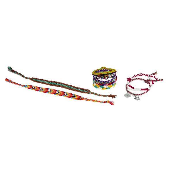 - Inhoud: 10 kleuren katoenen draad, 16 bedels, 2 ringen, een zuignap en een in kleur geïllustreerde gebruiksaanwijzing in 6 talen (Nederlands, Duits, Engels, Frans en Italiaans)