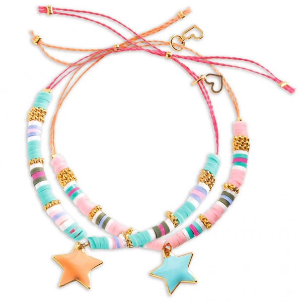 Met dit knutselpakket Star Heishi maak je 2 prachtige armbandjes met kleurrijke mini kralen et de beaux charme. Het knutselpakket bevat alle benodigdheden om mooie armbandjes te maken, twee organza zakjes om de sieraden in te bewaren en twee geïllustreerde kaarten om lieve berichtjes te schrijven. Een creatief werkje voor echte fashionista’s!
