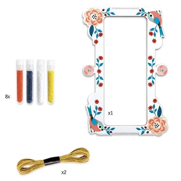 - Inhoud: 8 buisjes met mini-kralen – weefgetouw – 2 gouden klosjes van touw – 1 instructie boekje in kleur