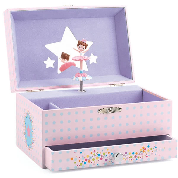 Een sierlijk ballerina muziekdoosje en juwelendoos in één, naar een prachtig design van Djeco.
