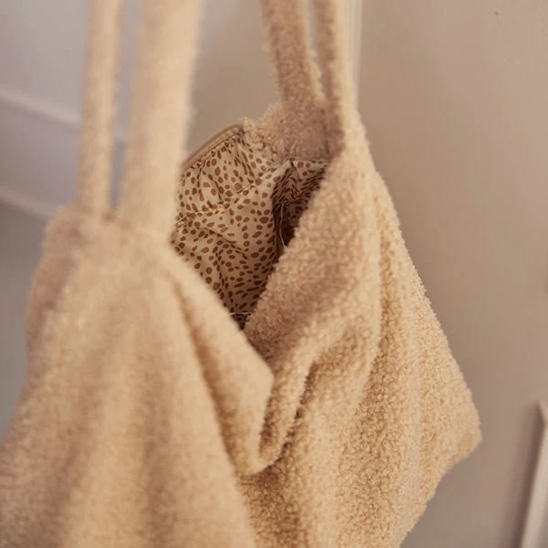 De ideale luiertas, shopper en mom bag in één! Deze tas gemaakt uit heerlijk zachte Boucle Naturel is de musthave voor elke mama! De tas is ideaal als luiertas wanneer je op pad gaat met jouw kleintje, maar ook om te shoppen, te sporten of als werktas. De tas is gemaakt van een zachte Boucle stof met aan de binnenkant een schattig stippenprintje. Daarnaast is deze tas binnenin voorzien van 2 handige opbergvakjes en wordt er standaard een verschoonmatje bijgeleverd. De luiertas sluit met een rits, heeft extra lange hengsels zodat je deze niet enkel op je schouder kan dragen, maar ook aan de kinderwagen.