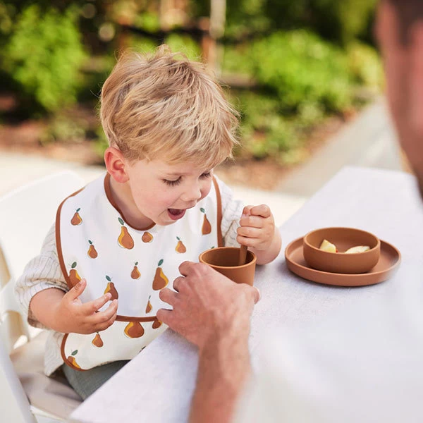 Dit slabbetje met leuk Pear design is geweldig. Het is een soort van schortje uit waterproof materiaal en beschermt de kleertjes van jouw kindje. Het slabbetje heeft een opvangbakje, ideaal voor kleine smospotten. Je sluit de waterproof slab met klittenband aan de achterzijde. Dat blijft goed zitten waardoor je kindje niet gemakkelijk zelf het slabbetje kan uittrekken.