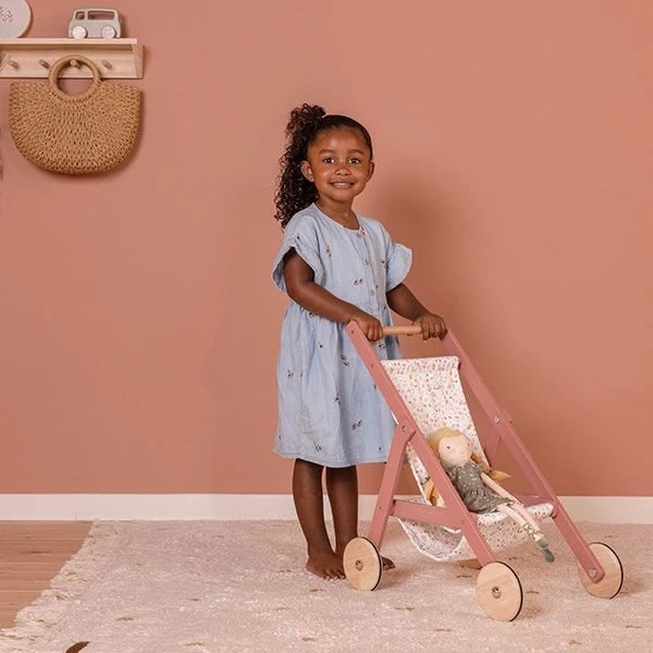 Met deze houten poppenwagen, versierd met het mooie Flowers & Butterflies dessin van Little Dutch, neem je jouw lievelingspop mee voor een wandeling! Het stevige frame is mooi afgewerkt en de houten wielen zijn voorzien van een rubberen rand voor extra bescherming. De buggy kan soepel worden voortgeduwd. Welke pop mag met je mee? Rosa, Jim, Sophia, Evi of Julia?