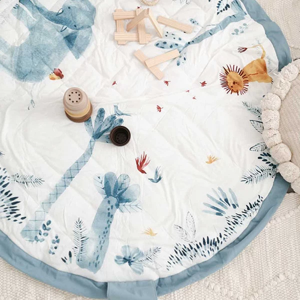 Deze zachte speelmat met Moulin Roty Baobab print is een praktisch 3-in-1 speelkleed, opbergzak en luiertas. De speelmat heeft een diameter van maar liefst 120 cm en is gemaakt van hoogwaardig zacht jersey-katoen, heerlijk soft, speciaal voor baby’s. Door de afneembare schouderriem te bevestigen tover je deze speelmat om tot een praktische opbergzak of luiertas om aan je schouder te dragen of aan je buggy vast te maken. De binnenkant bevat een leuke print, terwijl de buitenkant stijlvol afgewerkt is in effen kleuren. De koord waarmee je de speelmat omtovert tot opbergzak of luiertas is 100% veilig weg te werken met drukknopen, ideaal voor spelende kleintjes.