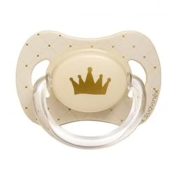 Kwalitatieve Suavinex fopspeen Crown Gold​ met anatomische siliconen speen (afgeplat speentje) voor baby’s en kindjes vanaf 0 tot 6 maand. Dit tutje is super leuk met zijn mooie design. De fopspeen heeft een anatomisch siliconen gevormde speen (schuin) wat als groot voordeel heeft dat de speen minder effect heeft op de stand van het gebit en een vorm heeft die mooi aansluit aan het gehemelte van jouw baby of kind. Siliconen spenen zijn reuk- en smaakneutraal en behouden hun kwaliteit vrij lang optimaal. Een siliconen fopspeen verlaagt de kans op een allergie. De medisch verantwoorde fopspenen van Suavinex zijn niet enkel veilig, maar nog mooi ook. Zo is deze tut afgewerkt met een transparante ring, ideaal voor jouw kleine lieverd. De ergonomische vorm en de zachte binnenzijde van dit tutje beschermt het gezicht van je baby. Het ronde schild van de fopspeen is voorzien van ventilatiegaten om huidirritatie te voorkomen. Bij deze tut kan de lucht vlot circuleren en het overtollige speeksel wegvloeien.